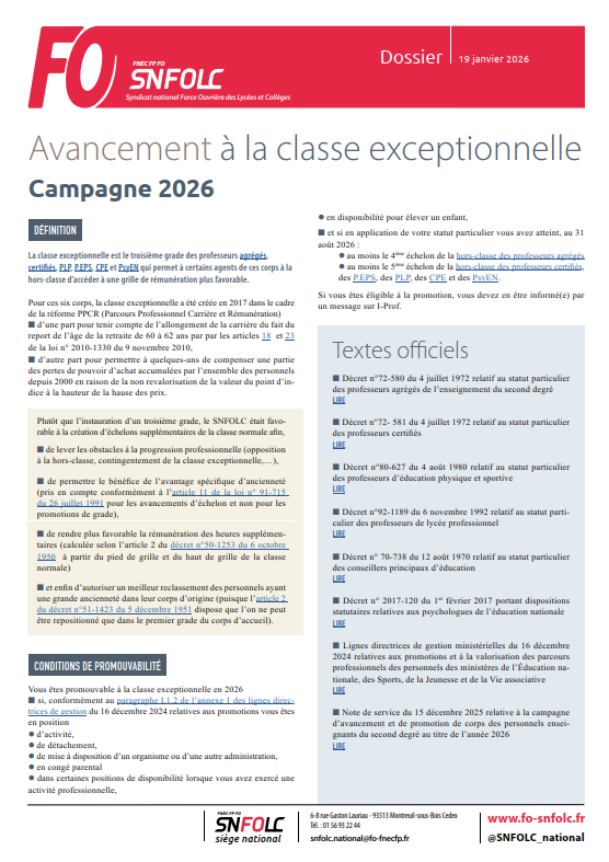 Pour rendre les opérations plus transparentes, le SNFOLC revendique le retour à barème chiffré, la publication des barres de promotion et l’examen par les commissions administratives paritaires du projet des proposés et des promus, comme l’exigeait le statut général de la fonction publique avant la mise en œuvre de la loi n° 2019-828 du 6 août 2019 dite de transformation de la fonction publique