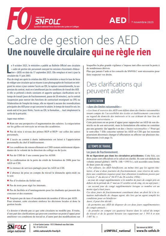 Le 9 octobre 2025, le ministère a publié au Bulletin Officiel une circulaire « cadre de gestion des personnels exerçant les missions d’assistants d’éducation » (AED) en date du 17 septembre 2025. Elle remplace et met à jour la circulaire du 11 juin 2003.