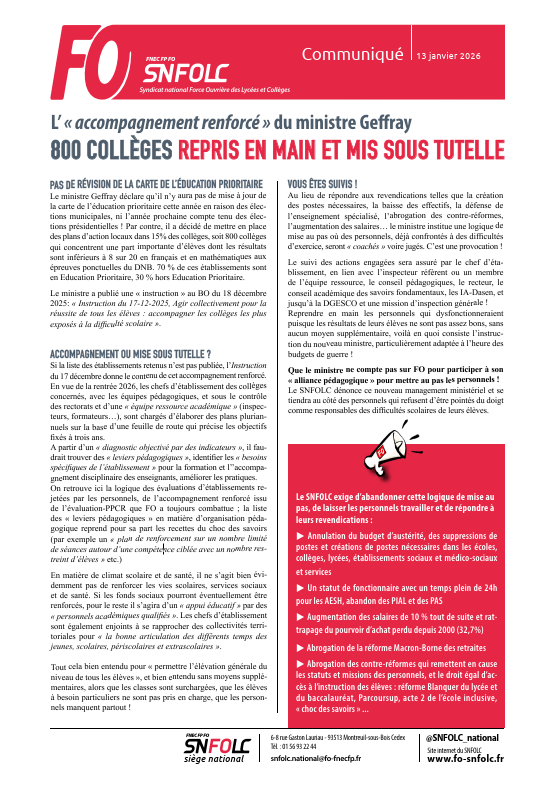 Le SNFOLC exige d’abandonner cette logique de mise aupas, de laisser les personnels travailler et de répondre àleurs revendications :