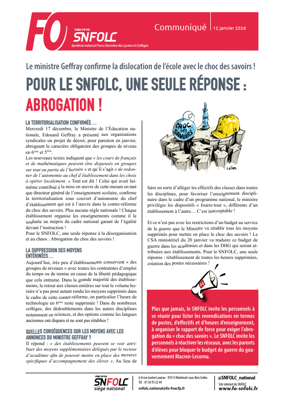 Plus que jamais, le SNFOLC invite les personnels à se réunir pour lister les revendications en termes de postes, d’effectifs et d’heures d’enseignement, à organiser le rapport de force pour exiger l’abrogation du « choc des savoirs ». Le SNFOLC invite les personnels à réactiver les réseaux, avec les parents d’élèves pour bloquer le budget de guerre du gouvernement Macron-Lecornu.